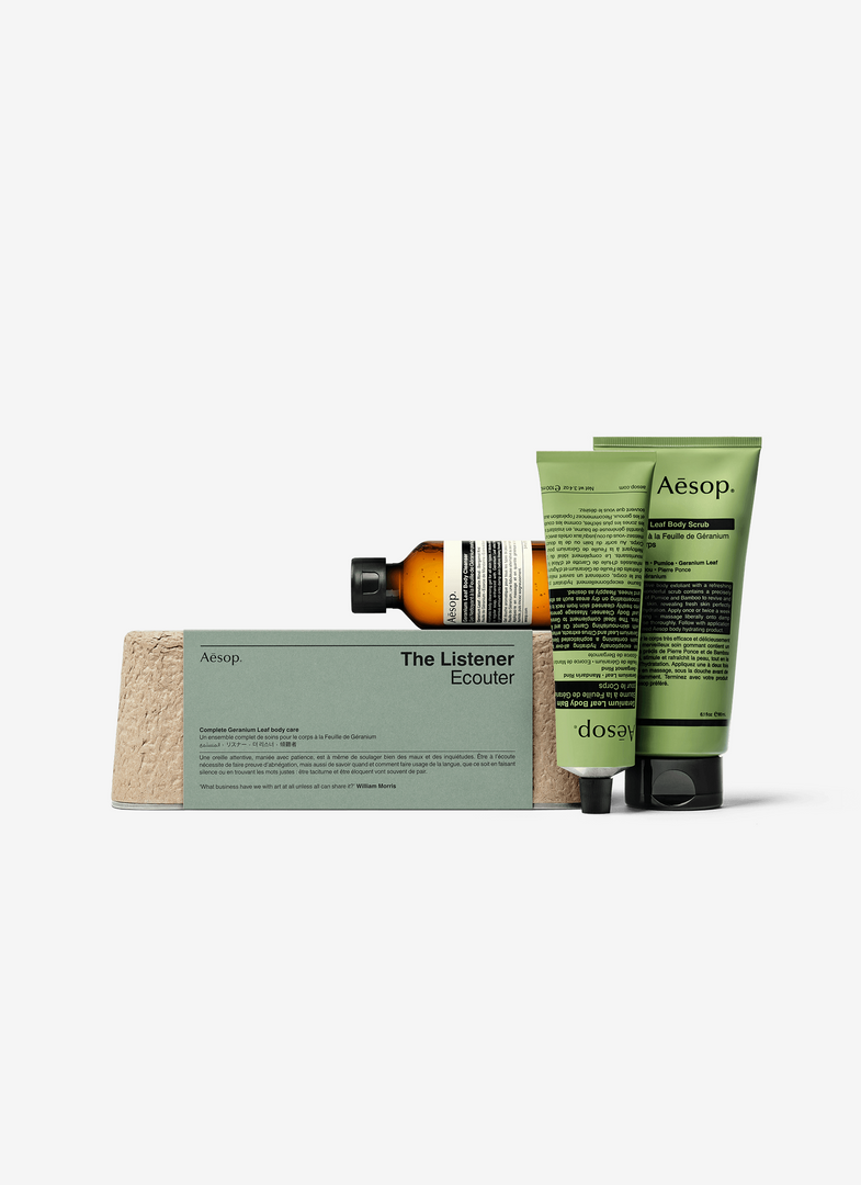 Aesop’s herbaceous Geranium Leaf formulations are housed in a recycled paper pulp case in The Listener Gift Kit. A trio of the refreshing Geranium Leaf Body Cleanser, exfoliating Geranium Leaf Body Scrub and nourishing Geranium Leaf Body Balm.Â