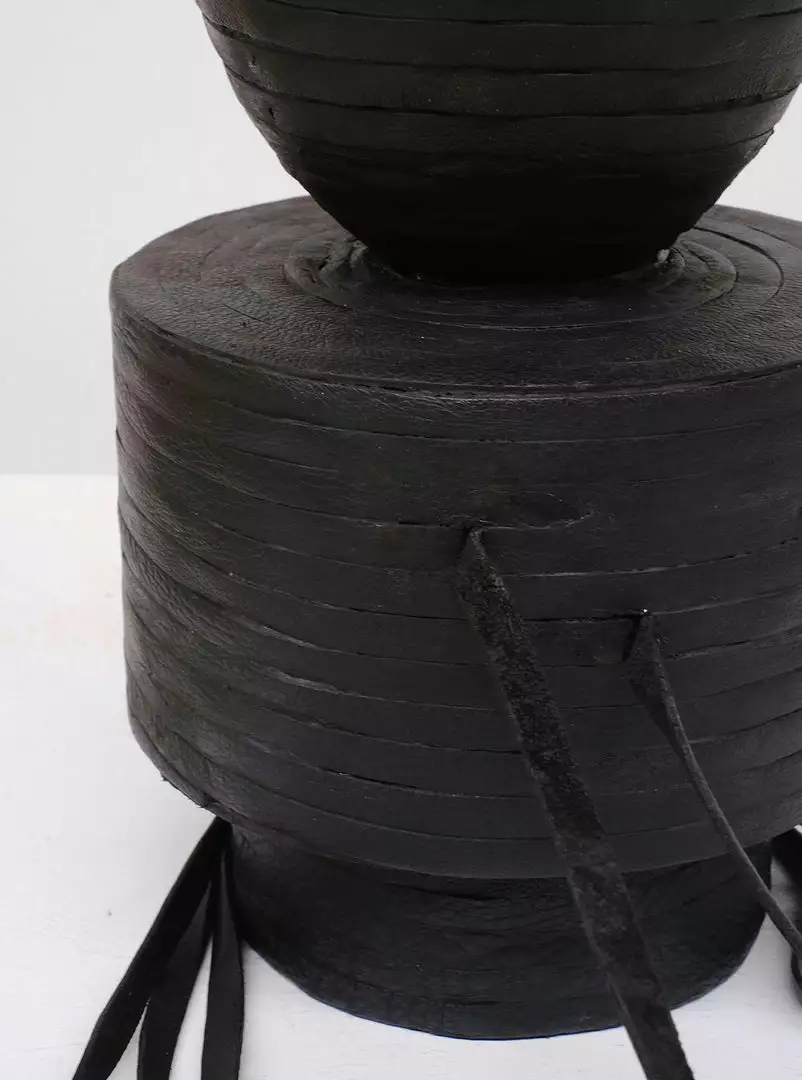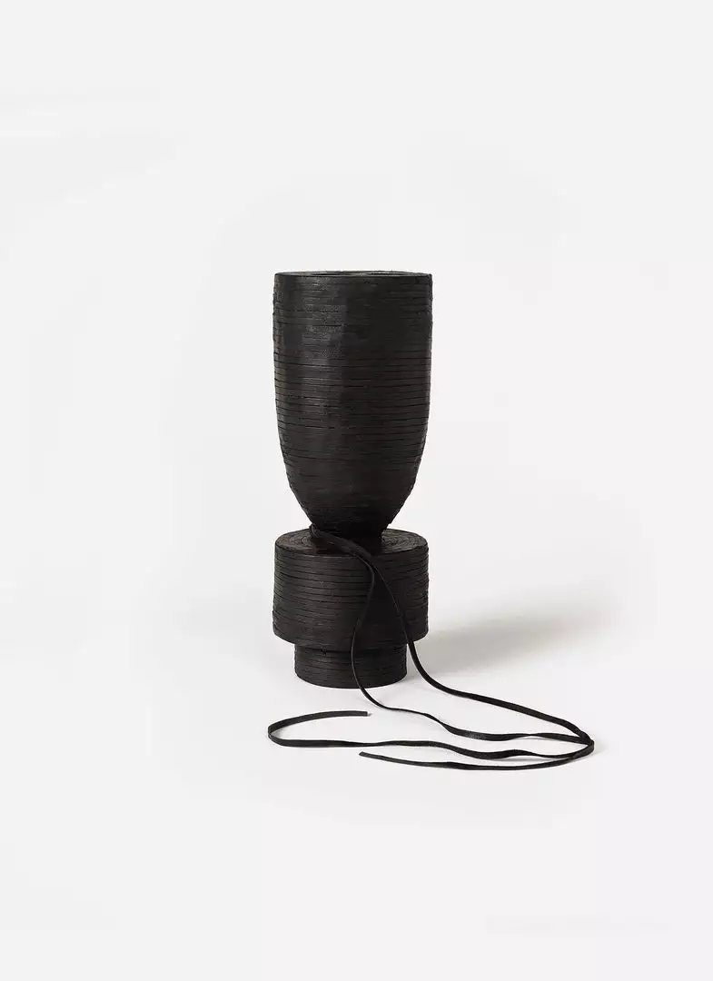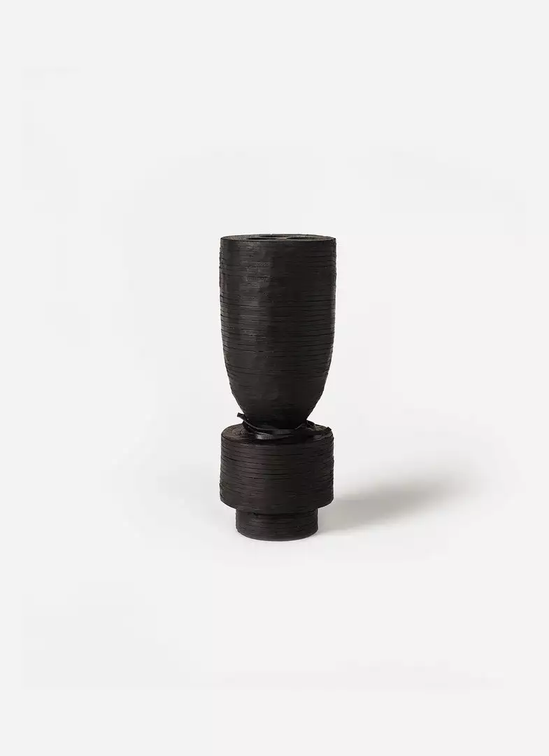 The Pot Vase with Leather by Belgian designer, Arno Declercq is a sculptural and beautiful object. Handcrafted from Yakisugi treated Iroko wood, this process is an ancient Japanese technique where the objects are burned to protect the wood from weathering and creates it’s unique patina. Wrapped entirely with leather ribbons, these ribbons can be tied firm at the base, or draped sinuously for dramatic effect. Three waterproof holes at the top can be used to hold floral arrangement; the perfect balance between design and functionality.