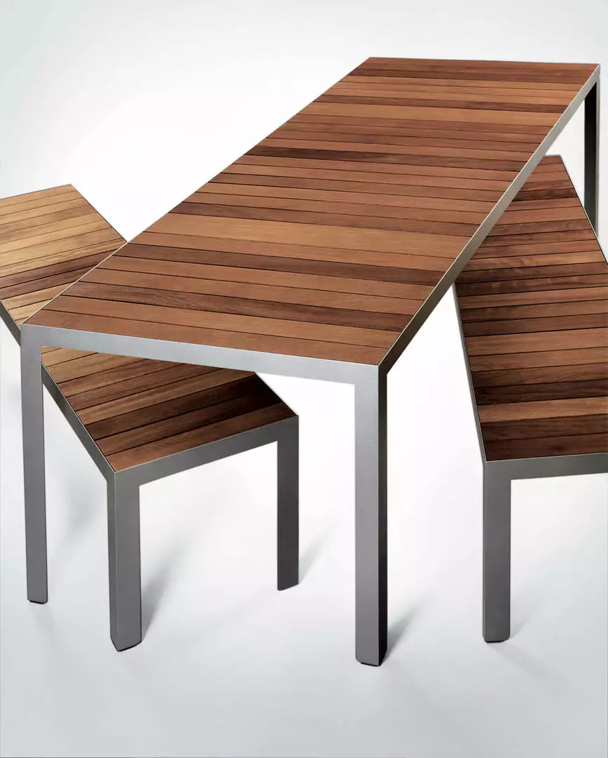 The iconic New Zealand outdoor table and bench seat designed by Bob McDonald in Rosewood timber. The zinc metal spray used on the mild steel frames is a sophisticated weatherproofing system that provides greater protection than galvanising. This table and bench won NZ Best Design Awards 2001.