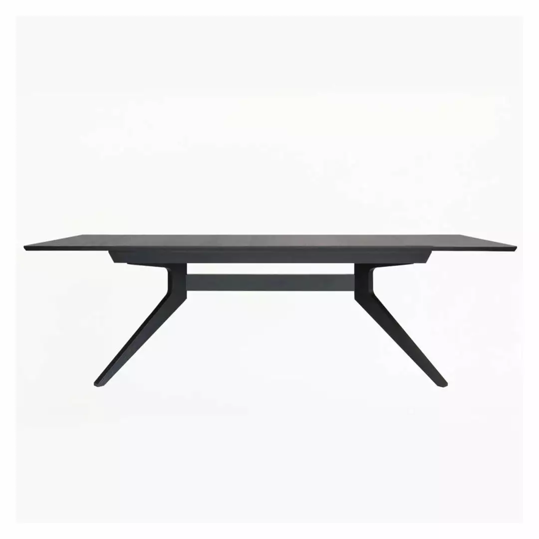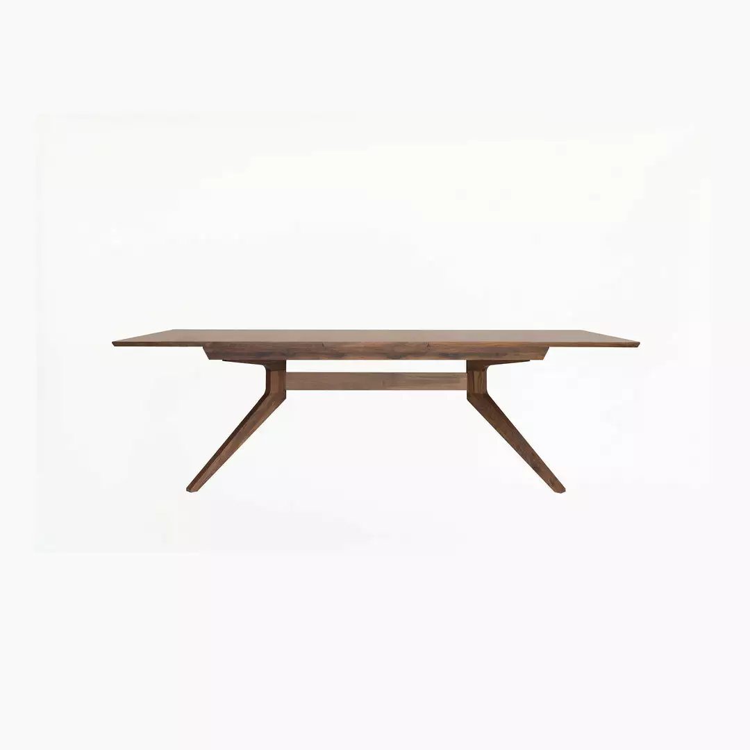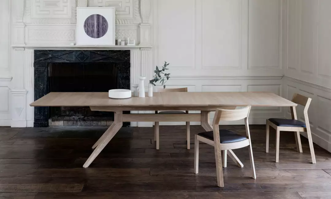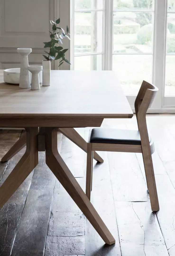 The Cross Extending Table by Matthew Hilton is a fine example of advanced wood manufacturing techniques. Made from a solid wood base, with a veneered top, it has two extendable leaves that are stored in the frame when the table is in a closed position. The table is large, yet retains a visual balance due to its unusually thick top. The design of the base allows for 6 to 8 chairs, or 12 to 14 when extended. This table is a particularly functional design: sturdy, handsome and built for multiple uses. Some assembly is required.