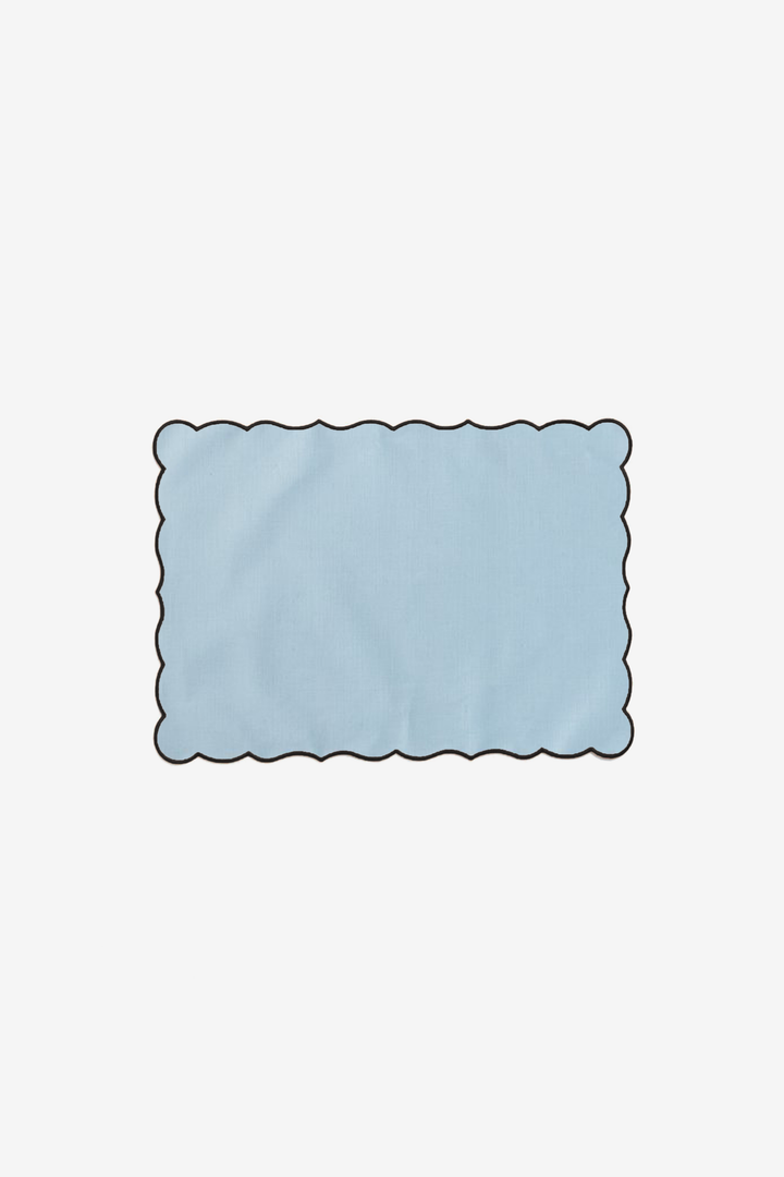 The Lido Placemat by Chiarastella Cattana is a coated linen placemat with beautiful scalloped edge. The scalloped shape is a homage to the Lido – a tiny stretch of land between the venetian lagoon and the Adriatic sea. The linen placemats perfectly embody the Lido’s relaxed atmosphere during the 1960s and add a vintage touch at any mise en place. Generous proportions, with a light blue linen base and elegant black scalloped trim.Â