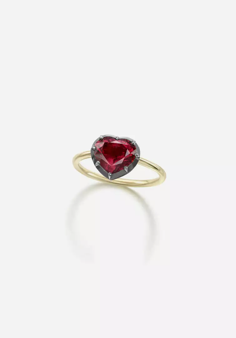 Set with a 1 carat heart shaped Ruby in Jessica McCormack’s signature Georgian cut-down setting in blackened gold. The 18k yellow gold Button Back sits comfortably against the skin, and can be worn stacked alongside classic gold bands from Jessica McCormack, or super-fine diamond eternity bands.Â