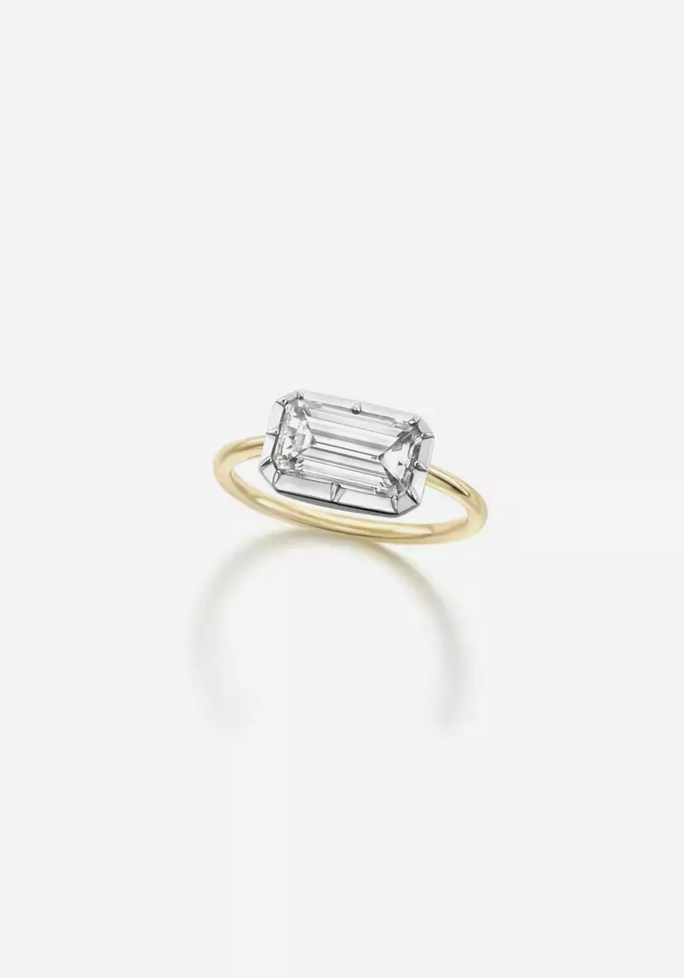 The Signature Emerald Cut Button Back Ring by Jessica McCormack from her Signature collection is set with a stunning emerald cut diamond in a JM iconic Georgian cut-down setting in the unique and modern east-west orientation. This is a beautiful piece to wear every day, combine with other rings, wear on its own, or as a timeless engagement ring, you will never tire of.