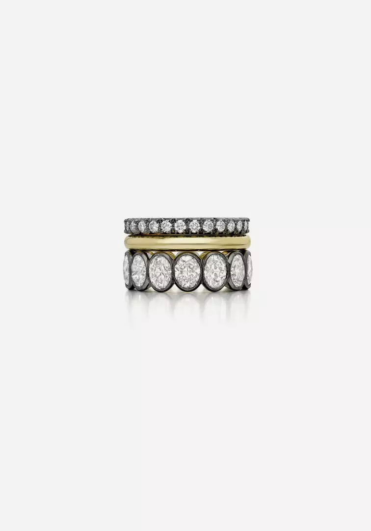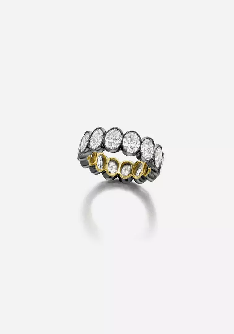 The Oval Diamond Eternity Band by Jessica McCormack is set with 7.02 carats of oval diamonds in a millegrain setting. Handcrafted in 18k blackened gold and 18k yellow gold.