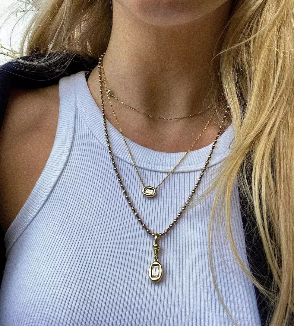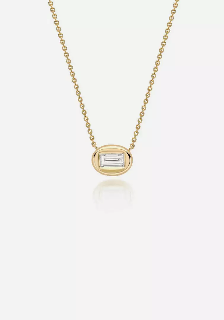 From the On The Rocks collection, this delicate pendant necklace is set with a 0.70 carat baguette cut diamond, encased in a puffy oval, handcrafted in 18k yellow gold. The pendant is defined by its soft organic contours and handcrafted shape.