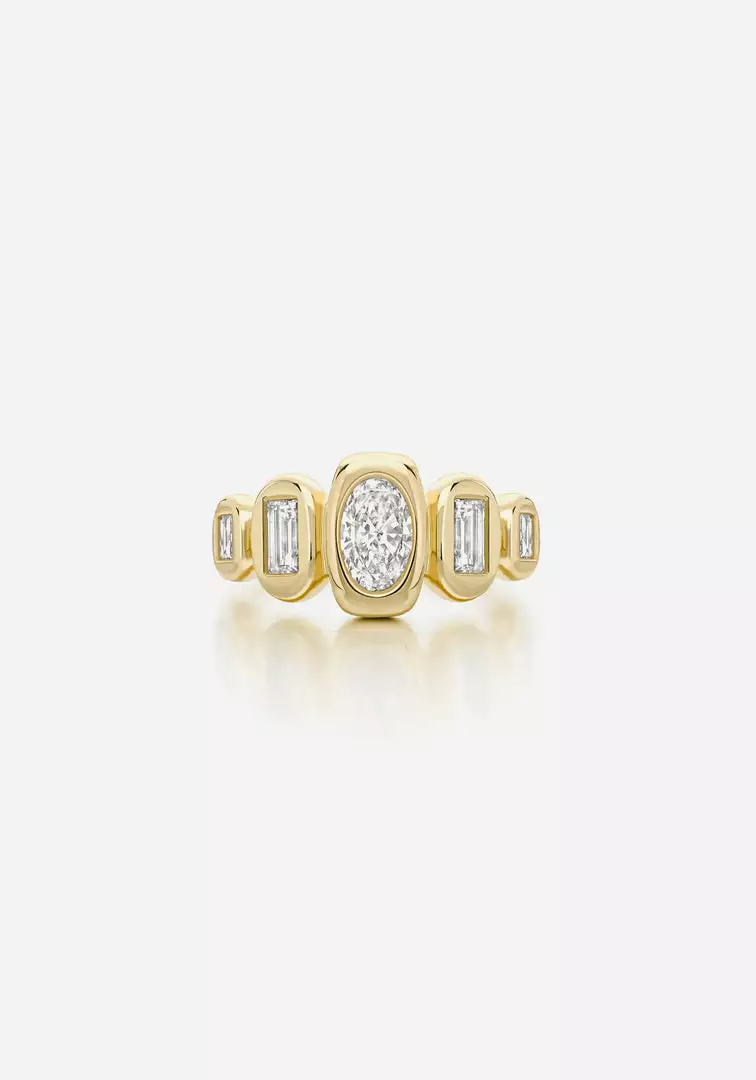 From the On The Rocks collection by Jessica McCormack, the beautiful multi-shape diamond ring is set with a 0.80 carat central oval-shaped diamond, flanked by two 0.30 carat baguette cut diamonds and two 0.15 carat carre; cut diamonds. Handcrafted in 18k yellow gold droplet surrounds. A ring that quietly and effortlessly elevates the everyday.