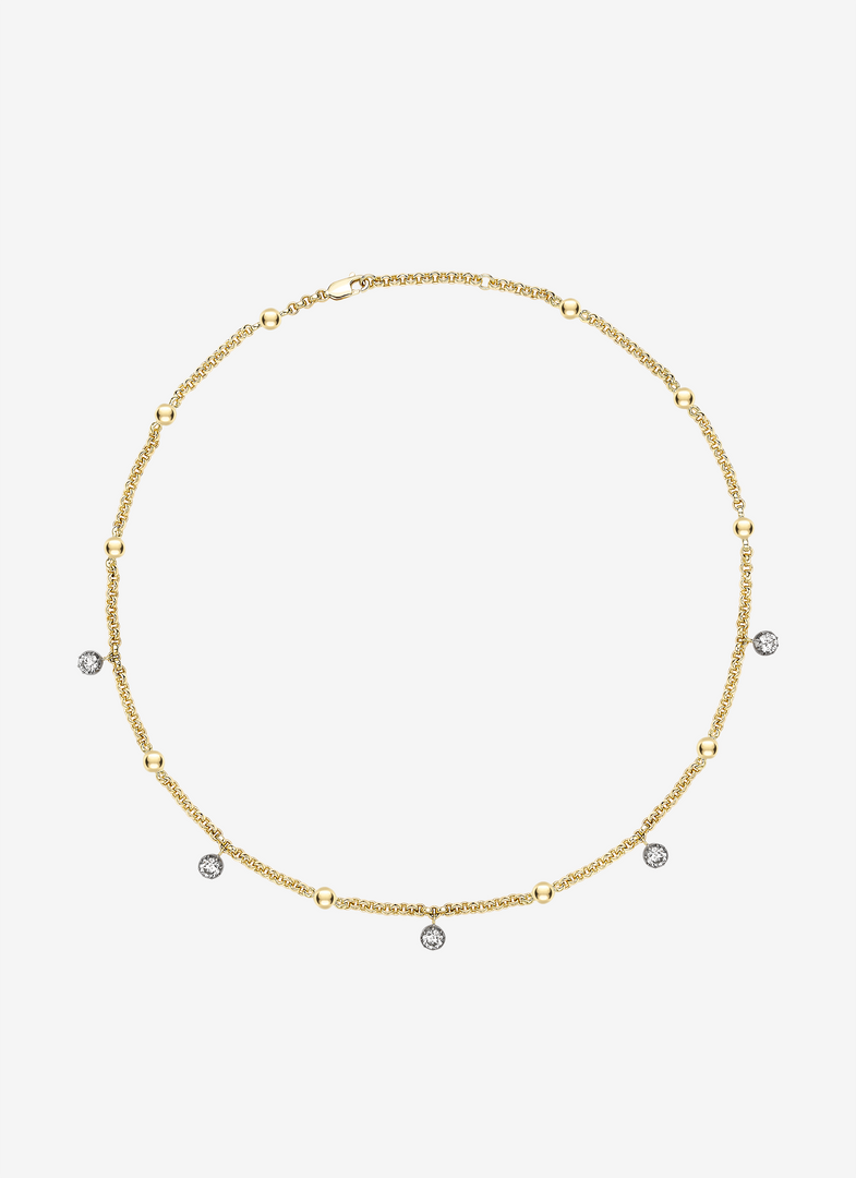 This unique belcher chain is punctuated with ten 18k gold balls and set with five round brilliant diamonds, each set in our signature Georgian cut-down setting in blackened 18K white gold for a softer look. Handcrafted in blackened 18k white and 18k yellow gold, the total diamond weight is approximately 0.93 carats and chain length measures 18 inches with a jump ring at 17 inches ready to be worn for any occasion.