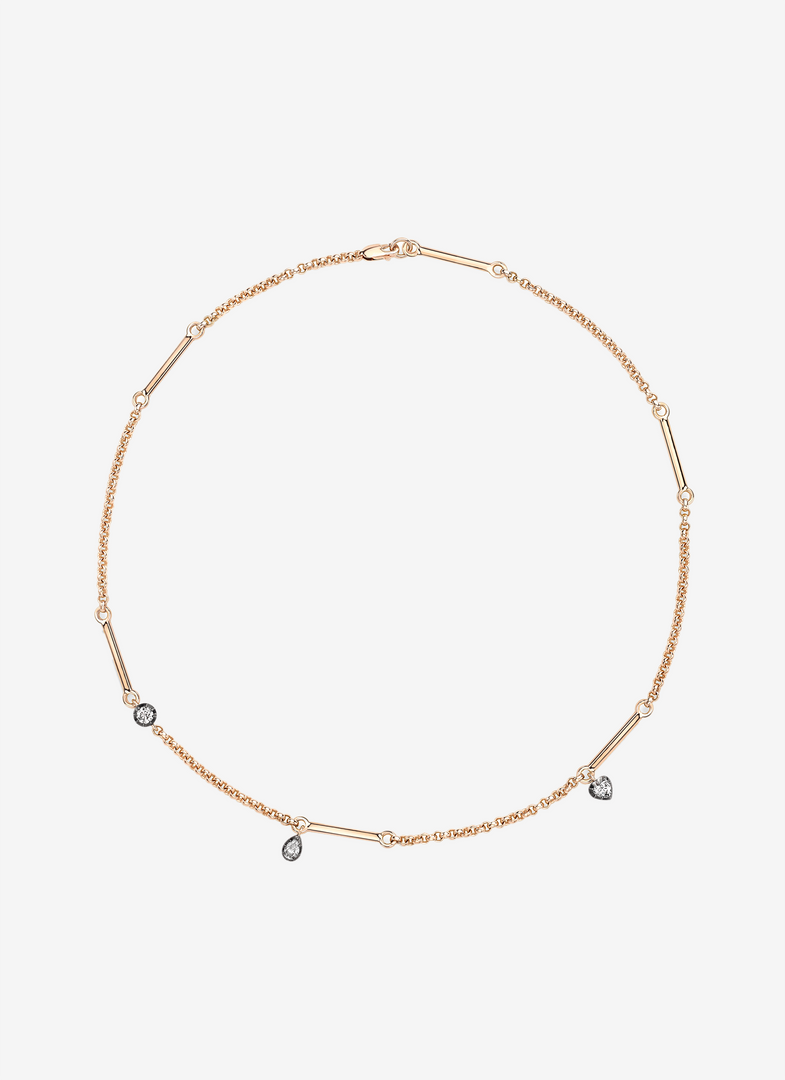 This unique belcher chain is punctuated with six 18k rose gold bars measuring 1.8mm in width and 29mm in length, as well as one 0.30 carat heart-shaped diamond, one 0.34 carat pear-shaped diamond and one 0.30 carat round brilliant diamond, all in Georgian cut-down settings and our signature Button Back finish. Handcrafted in blackened 18k white and 18k rose gold, the total diamond weight is approximately 0.94 carats and chain length measures 18 inches.