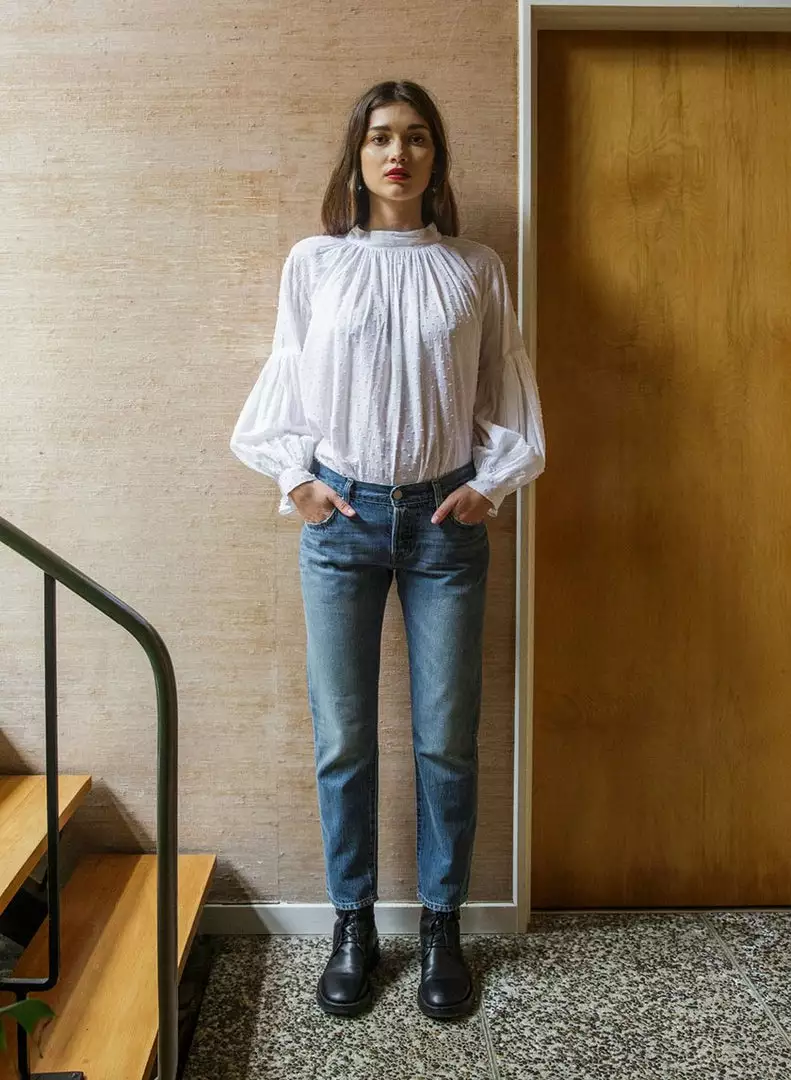 Soft and billowing, the voluminous sleeves of the Preacher Top from Mahsa bring a touch of romance to any day. Crafted in a soft cotton voile with tactile and textured dots which channels the white cottons of the Victorian era and gives a cinematic nod to Sophia Coppola’s costuming from the wardrobe of ‘The Beguiled’, the loose silhouette offers the option to wear loose or tucked into a favourite pair of vintage jeans, while keeping a feminine feel. A high neckline, fastened with a covered button at the back of the neck, adds interest to the exposed selvedge detail and subtle open back. Mahsa’s Preacher Top is relaxed with a hint of formality, ideal for garden parties and evening romance. Â