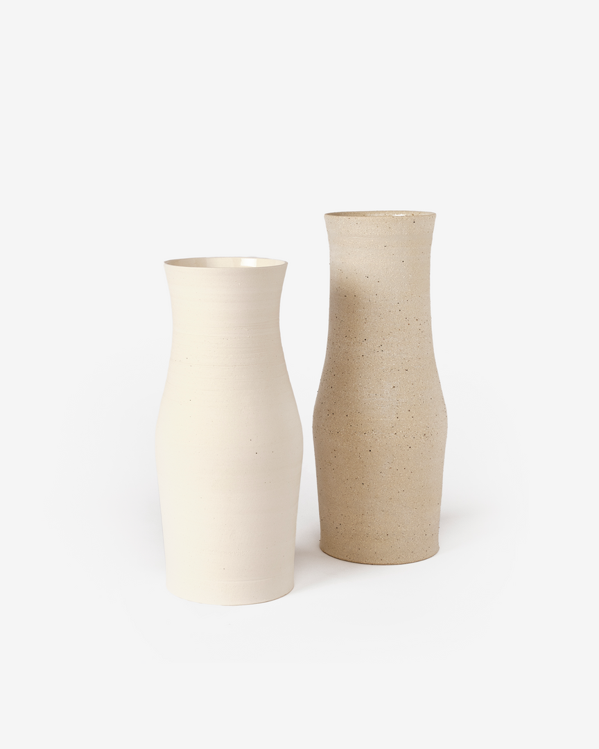 Margi Nuttall’s vase forms are bold and simple emphasising weight and stillness allowing material to speak, with clays and glazes reflecting this. The large rendition of the Ursula makes for a soft statement centerpiece or floor standing vase.Â