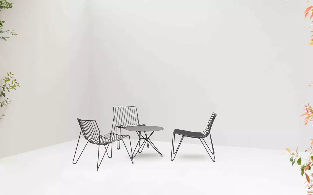 The design for the Tio range by Massproductions was the end result of a few months of thinking, sketching and sculpting. Chris Martin’s point of departure was to arrange a fan of wires into a comfortable seat and then connect them in a straightforward and logical frame, which minimised the amount of steel used. The appeal comes from pragmatic thinking, executed within the restraints of the materials characteristics and according to an industrial productions process.Â