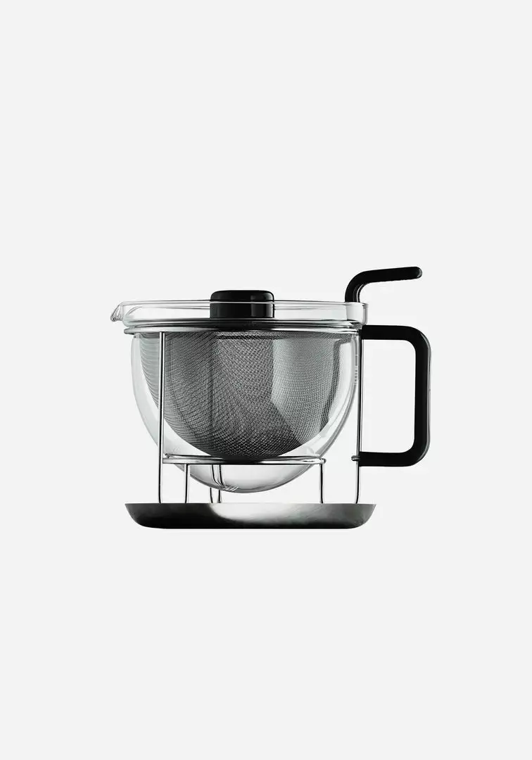 This design makes the strainer almost as large as the teapot to give the tea leaves more room to develop their aroma. The strainer is made of durable, tasteless, stainless steel mesh, and the pot is made of fire-resistant borosilicate glass. The specific geometry of the glass ensures that the last remaining liquid remains in the jug with the tea crumbs it contains.