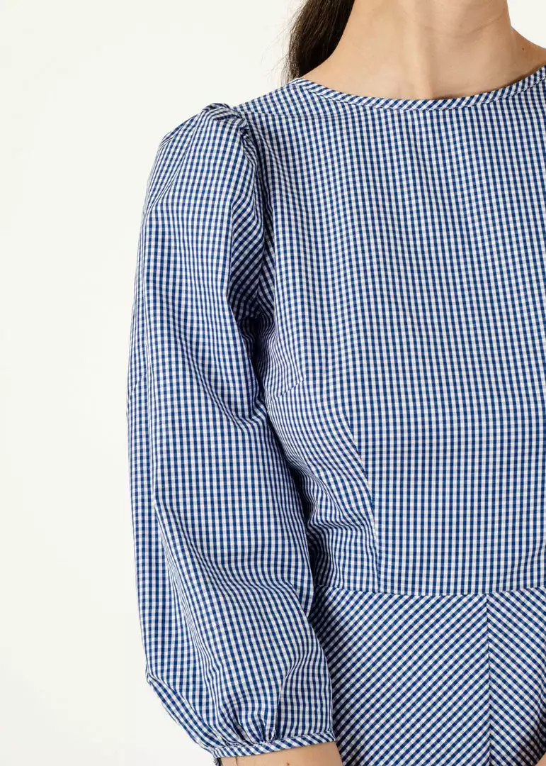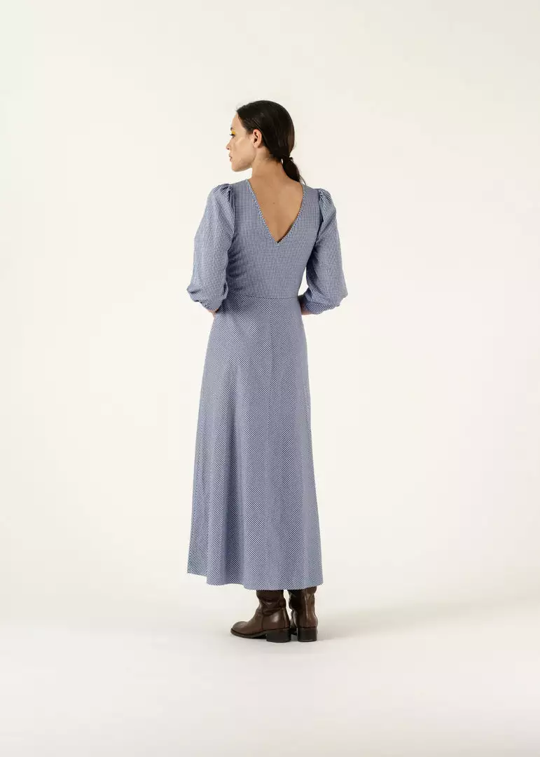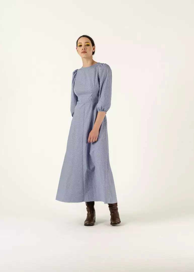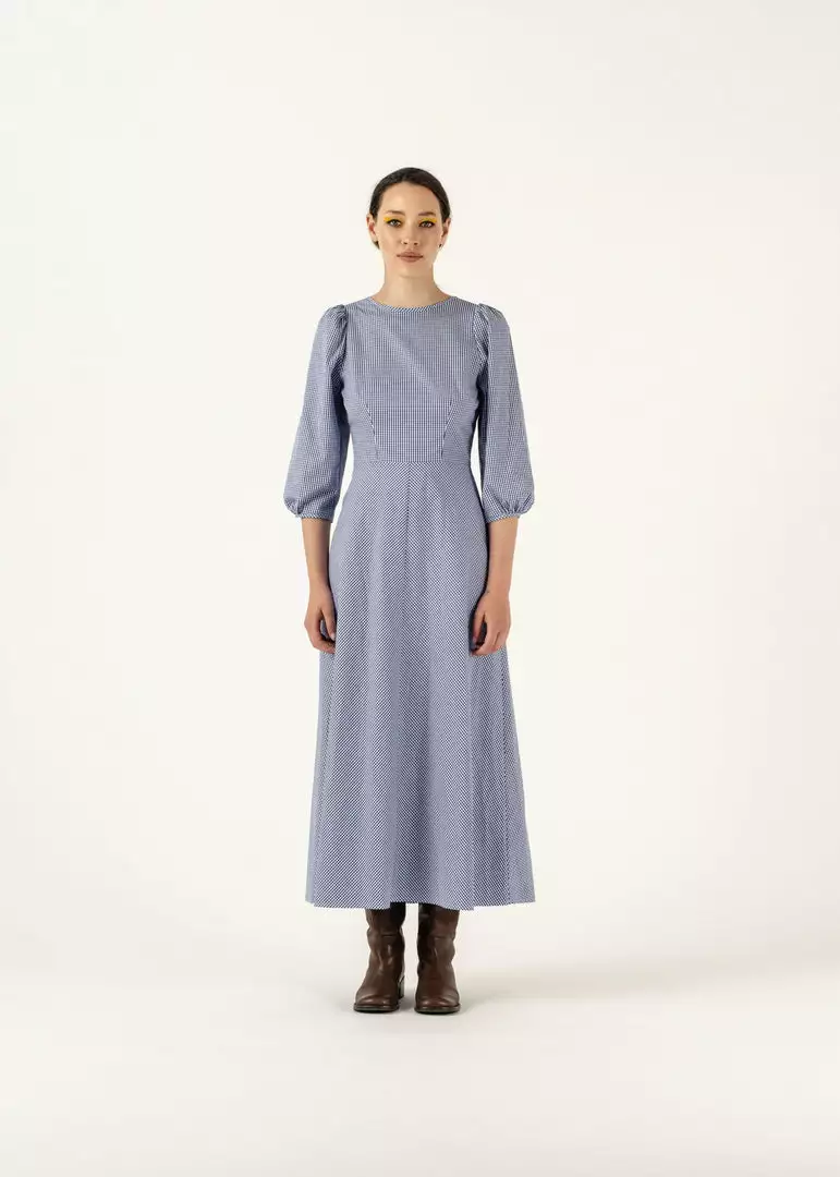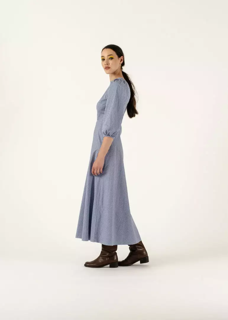The lovely Robin Dress by Penny Sage returns for AW22 in dainty Bay Blue Gingham. It features a longer hem, full skirt, 3/4 sleeves that softly gather at the shoulder and puff below the elbow, a higher neckline at the front and a deep V at the back. The bodice is shaped with front darts leading to a fitted waistline and bias cut panelled skirt and fastens at the side seam with an invisible zip for an un-interrupted, clean finish. A trans-seasonal piece that feels summery during the warmer months, and uplifting in winter.