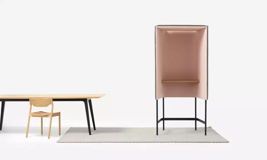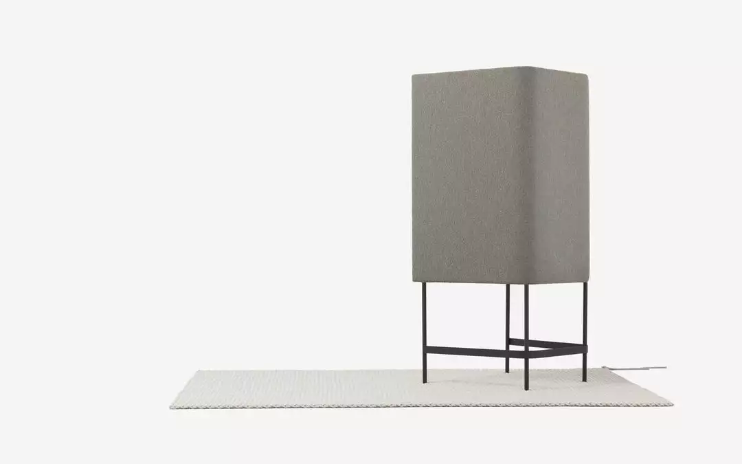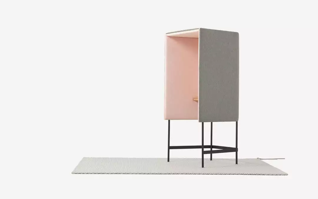 The Free Standing Phone Cabin is designed by Simon James to provide privacy while on a mobile phone, sound absorbing foam creates a unique environment for conversation seclusion. A small inbuilt desk allows for note taking while on the phone as well as the option of soft wiring to allow for power and lighting. Contrasting fabric optional on the cabin roof or the interior / exterior wall.