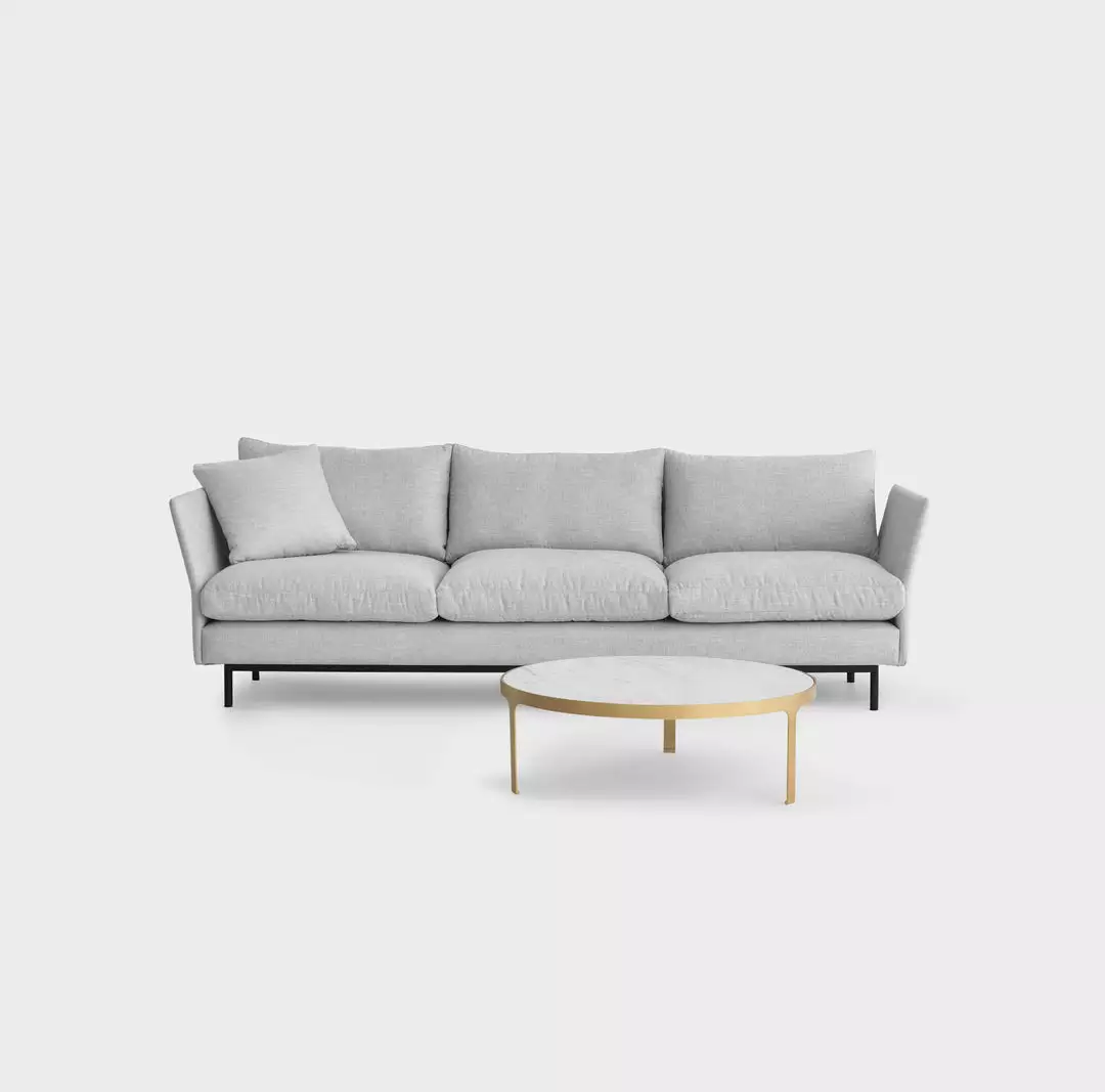 The Layabout Sofa by Simon James is designed for the home, an elevated frame gives a light appearance, while the soft feather cushions give the sofa a generous feel. It is constructed from sustainably grown pine, steel re-enforcing and multi-density foam.