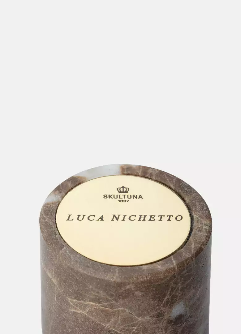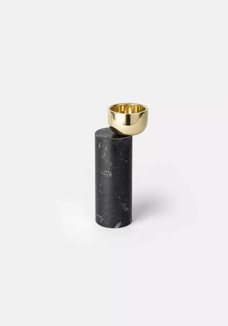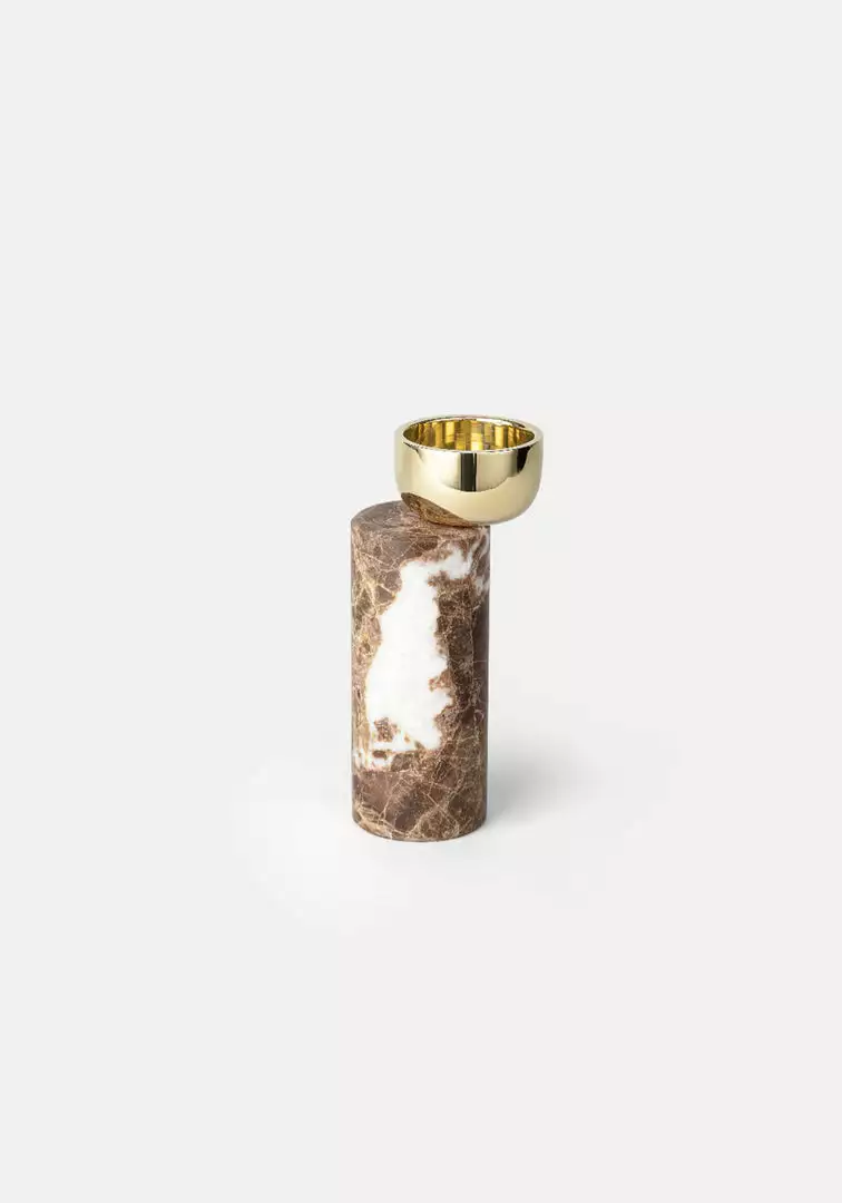 The Streamer Candleholder by Luca Nichetto for Skultuna was inspired by his travels around Mexico, and Central-American Modernist architecture. The candleholder consists of a solid geometrical base, with a brass candleholder balanced on it.