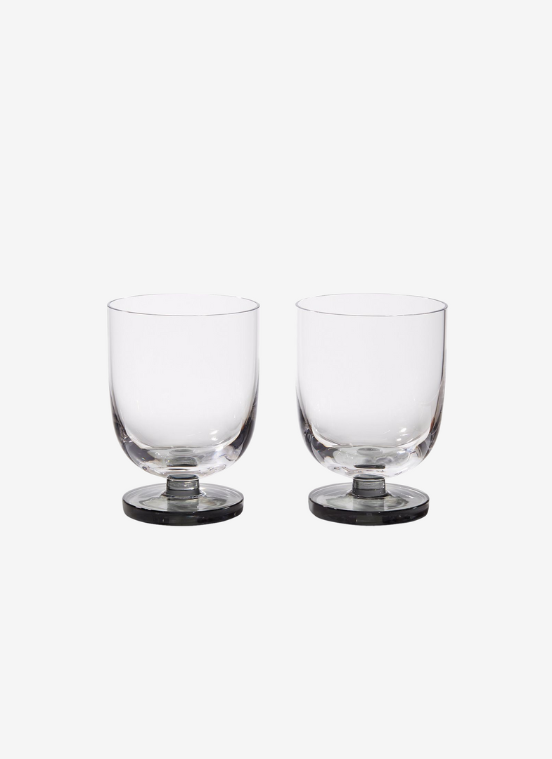 A versatile pair of water goblets by Tom Dixon easily utilised for other libations. Featuring mouth-blown glass with a smoky hint of colour, the Puck collection is minimal and heavy-weight with a solid base, taking its inspiration from game pucks. Puck glassware is sturdy and resilient.Â