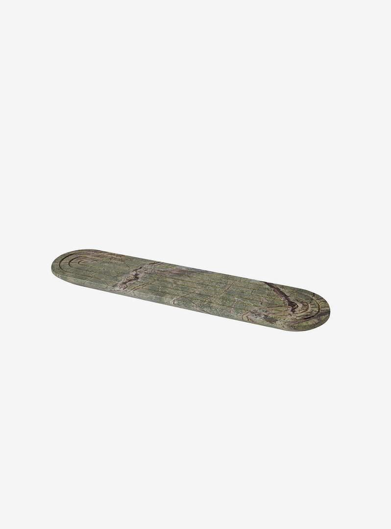 Part of the Rock collection of sculptural artefacts crafted from Green Forest marble by Tom Dixon, this long grooved chopping board or serving platter is designed to furnish kitchen counters and banqueting tables, equally perfect for preparing and presenting food. The pattern and texture of each piece is entirely unique and is a celebration of the individualistic nature of marble, whose veins of colour vary from piece to piece and are wholly dependent on the block of marble it was carved from.