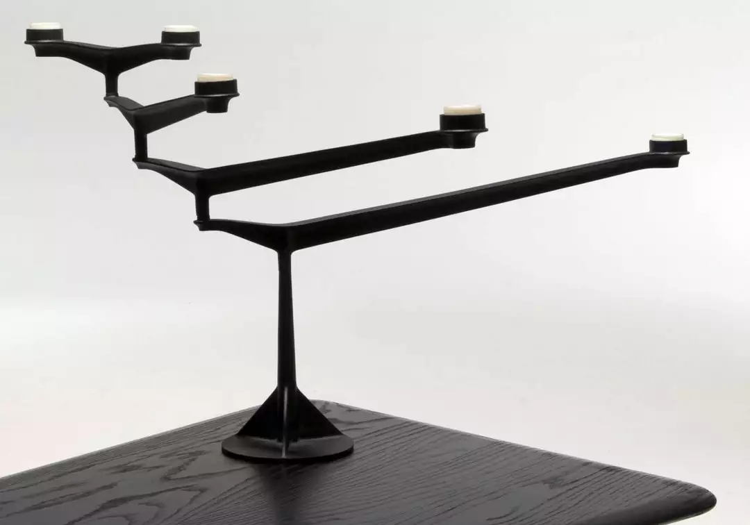 Taking its construction from the robust components of bridges and engines from the Victorian era, Tom Dixon’s Spin Candelabra is an inverted mobile, and a revolution in candlesticks. Made from robust, honest indestructible cast iron, five candles can be placed on its extending arms. Its adaptable design that lends the Spin its name sees each arm spin to rest in different positions, producing infinite arrangements and giving it its iconic status and place in table-top engineering. The Spin Candelabra accomodates a variety of candle sizes such as tea light and tall candles.